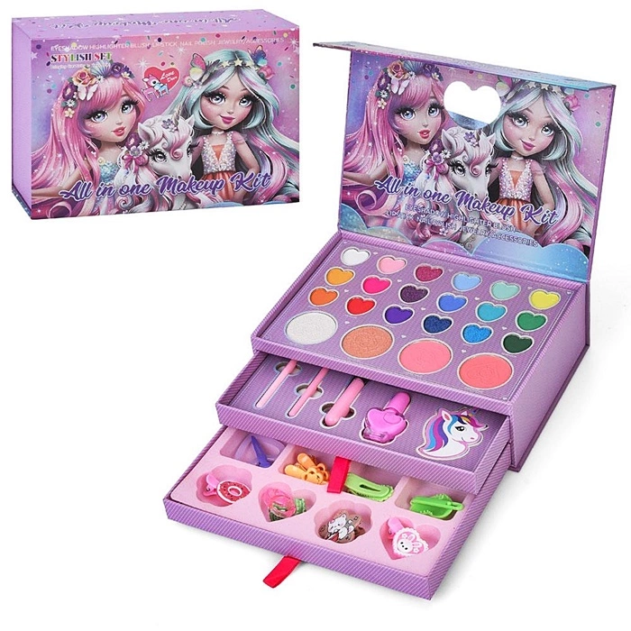 Косметика LD6161 (18шт) 3-х ярусна, тіні, рум'яна, пензлики, набір для манікюру, лак, пилка, розділ. для пальців, прикраси, дзеркальце, з аксесуар, в коробці 22*16*6.5см