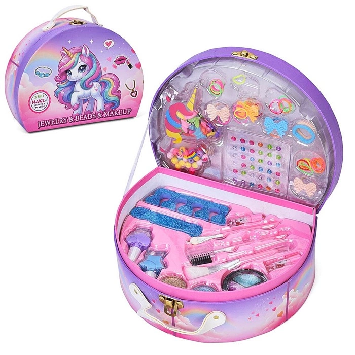 Косметика LD6530-7 (12шт) тіні, блискітки, пензлики, помада 2шт, набір для манікюру, лак 2шт, пилка, розділ. для пальців, наклейки, прикраси, намистини, з аксесс., у валізі 23*17*9см