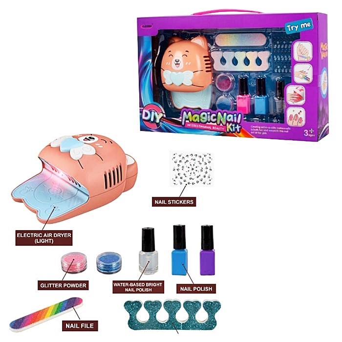 Косметика S014-4 (30шт) набір для манікюру, лампа (світл., повітря), лак 3шт, пилка, розділ. для пальців, гліттер, наклейки, з аксесуар., на батар., в коробці 32*20*7см