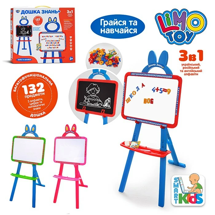 Мольберт 2-сторонній магнітний 0703UK-ENG (12шт) 3 кольори, магніт.букви, цифри, мат.знаки, укр/рус/англ алфавіти, крейда, маркер, наклейки, губка, регул. по висоті, у коробці 46*41*6см