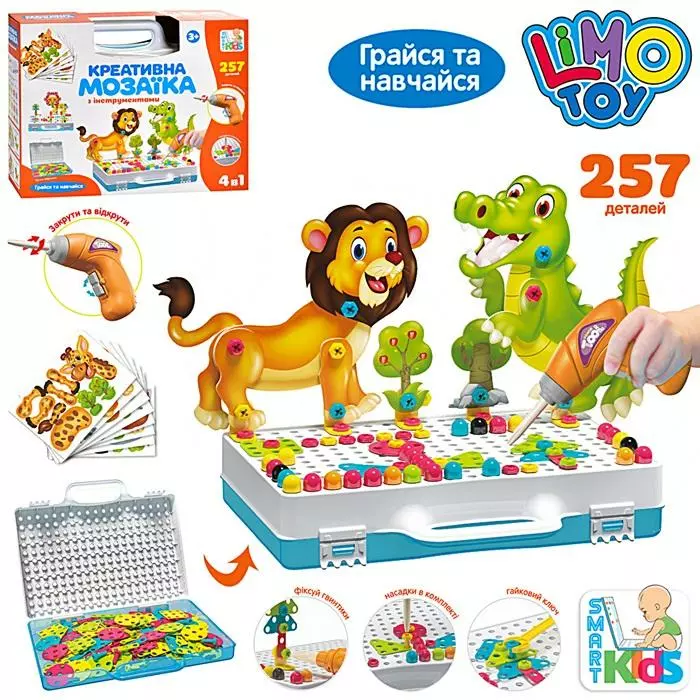 Набір для творчості "Мозаїка" M5598 (18шт) 257дет., 4в1, шуруповерт (оберт. насадка), на батар., на шурупах, картки, тварини, з інструм., з аксесуарами, в валізі, в коробці 31*25*8.