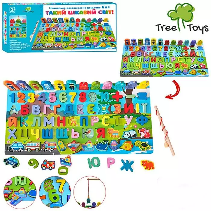 Дерев'яна іграшка навчальна Дошка MD1927 (20шт) 6в1, рибалка, сортер, рамка-вкладиш, (азбука укр.букви, цифри, фігурки, тварини, транспорт), з аксесуарами, в коробці 46*24*4.5см