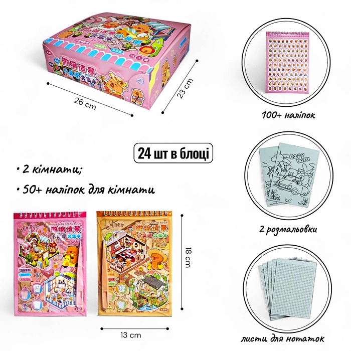 Набір для творчості "Зроби кімнату" "Капібара" TT88-15 (240шт) 2види, блокнот (18*13см), кімната 2шт, наклейки, зроби/прикрась кімнату, пінцет, румбокс, розмальовки, у пакеті, 24шт у коробці 26*23*12см. Ціна за 1шт